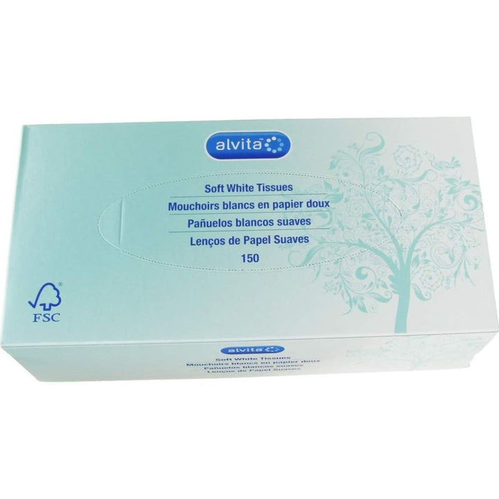 150 2-ply soft white facial tissues, supplied in the customary dispenser box with perforated top.