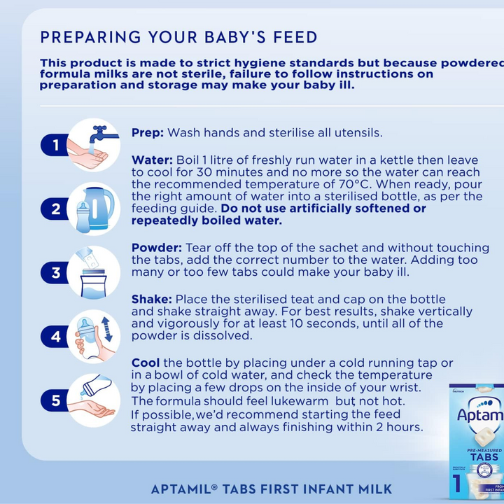 Aptamil Follow On baby formula contains Vitamin D to support the normal function of the immune system. *Each tab should be added to 30ml/1 fl.oz of water. Always follow preparation instructions. **Suitable as a sole source of nutrition from birth and as part of a weaning diet from 6 months. As required by the legislation for all infant formula ***As required by the legislation for all infant formula Inspired by 50 years of research in early life science.