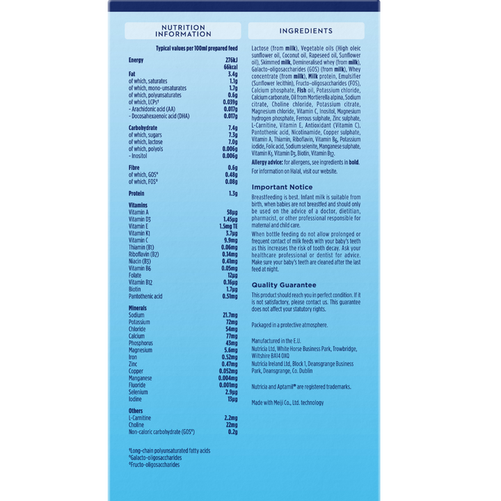 Lactose (from Milk), Vegetable Oils (Palm Oil, Coconut Oil, Rapeseed Oil, Sunflower Oil, High Oleic Sunflower Oil), Skimmed Milk,Demineralised Whey (from Milk),Galacto-Oligosaccharides (GOS) (from Milk), Whey Concentrate(from Milk), Milk Proteins, Fructo-Oligosaccharides (FOS), Calcium Phosphate, Fish Oil, Potassium Chloride, Oil from Mortierella Alpina, Sodium Citrate, Choline Chloride, Potassium Citrate, Vitamin C, Magnesium Chloride, Emulsifier (SoyLecithin), Inositol, Taurine, Magnesium Hydrogen Phosphate, Ferrous Sulphate, L-Carnitine, Zinc Sulphate, Vitamin E, Uridine 5-Monophosphate Sodium Salt, Cytidine 5-Monophosphate, Antioxidant (Vitamin C), Pantothenic Acid, Adenosine 5-Monophosphate, Inosine 5'-Monophosphate Sodium Salt, Pantothenic Acid, Adenosine 5-Monophosphate, Inosine 5'-Monophosphate Sodium Salt, Nicotinamide, Guanosine 5-Monophosphate Sodium Salt, Copper Sulphate, Vitamin A, Thiamin, Riboflavin, Vitamin B6, Folic Acid, Potassium Iodide, Sodium Selenite, Manganese Sulphate, Vitamin K1, Biotin, Vitamin D3, Vitamin B12