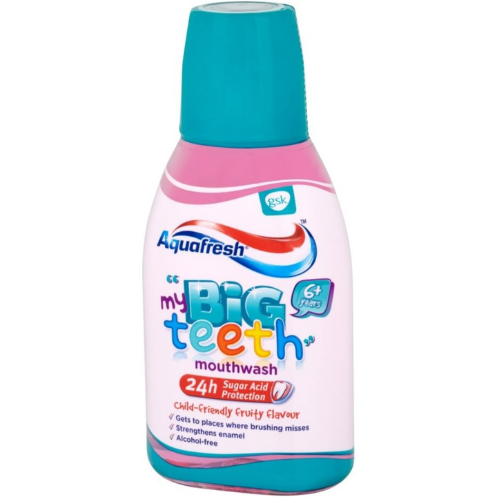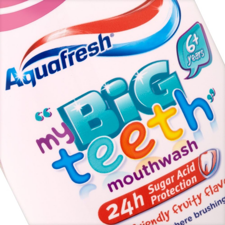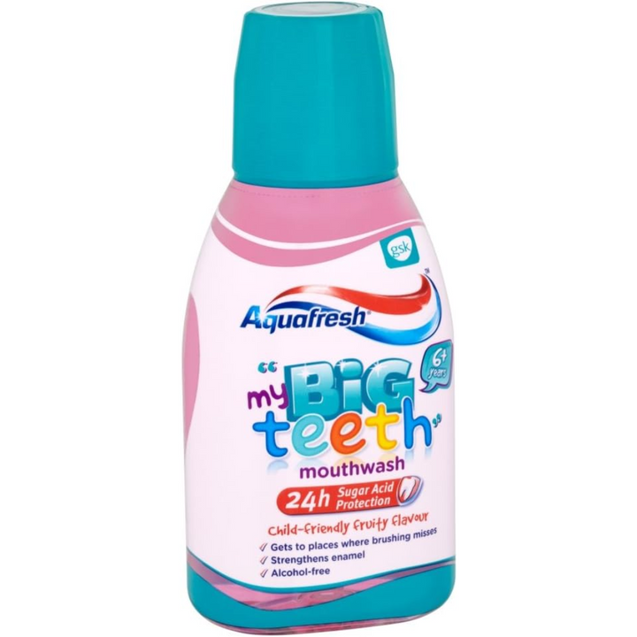 Aquafresh Big Teeth Fruity Mouthwash 6-8 Years 300ml is a fluoride mouthwash that helps to care & strengthen your child's teeth. It contains an antibacterial formula that fights plaque and kill's germs.