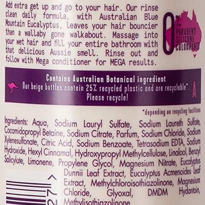 Aussie's unique formula, with Australian Kangaroo paw flower, can be used daily. It cleanses without the build up that causes hair to droop. Hair will be bouncy and clean. Use this shampoo for breathtaking cleanliness. If your hair's already in pretty good nick and you want an effective, everyday cleanser that won't cause build-up, look no further than Aussie Mega. Use as often as you like and your hair will flow and shine all day long. Gives your hair some boing and bounce.