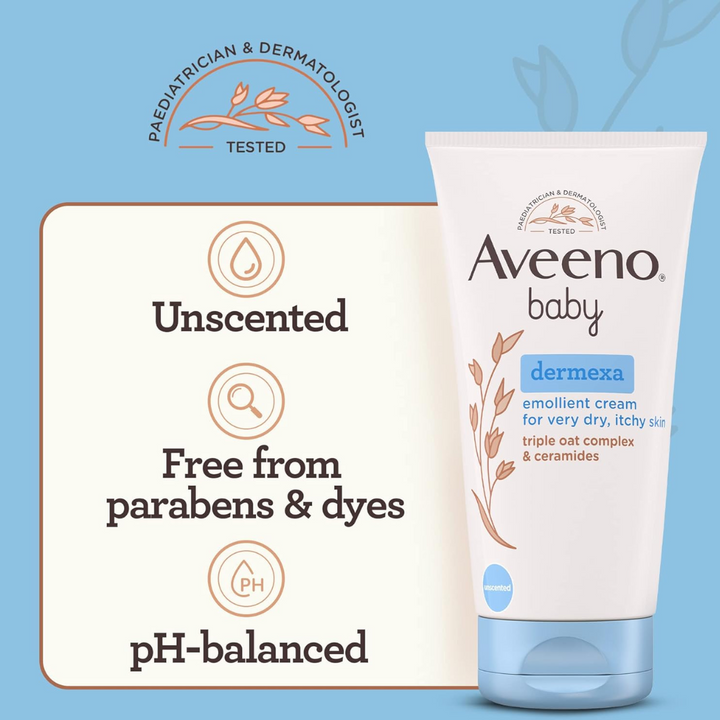 AVEENO Baby Dermexa™ Emollient Cream contains our highest concentration of oat extract*, oat oil and prebiotic oatmeal for healthy looking, more resilient skin from Day 1. It is free from parabens and can be applied to the whole body twice a day.