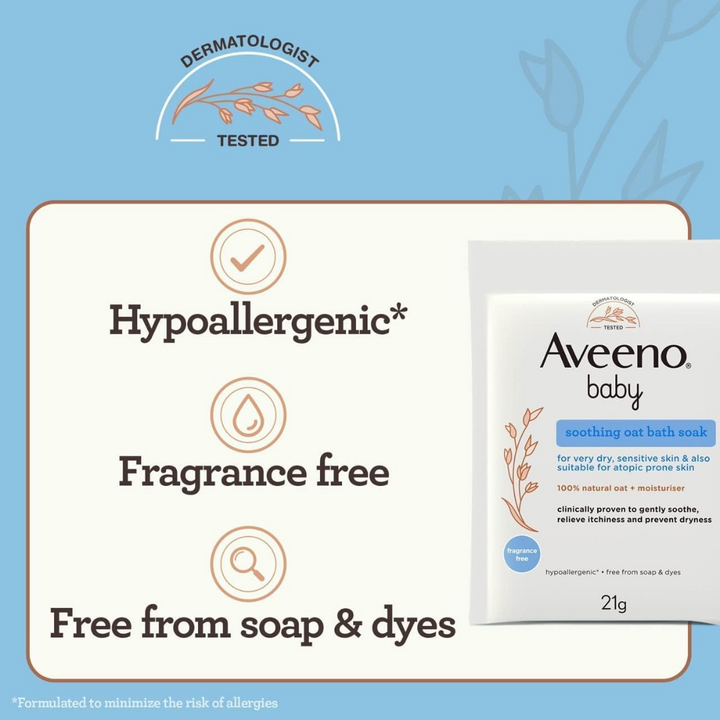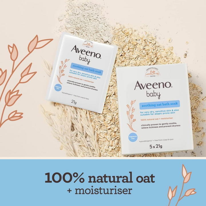 Formulated with 100% natural oat + extra moisturiser for baby skin benefits, AVEENO® Baby Soothing Oat Bath Soak is a light-touch skin care that comes with our highest concentration of oats. This product is clinically proven to gently soothe, relieve itchiness and prevent dryness.This Soothing Oat Bath Soak formula is rich in antioxidants found in oats, which is known to reduce discomfort & itchiness.