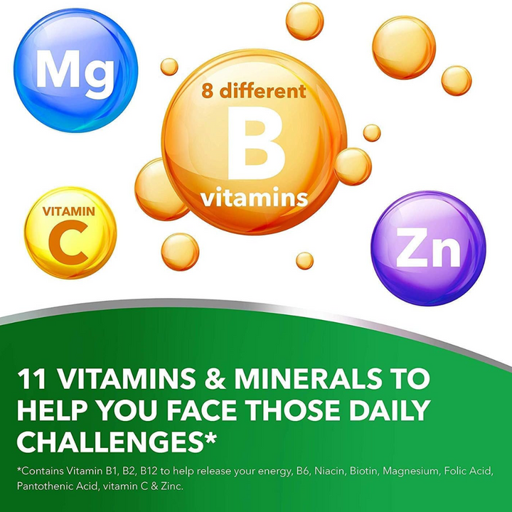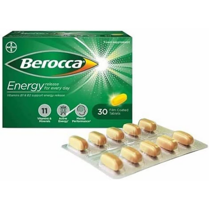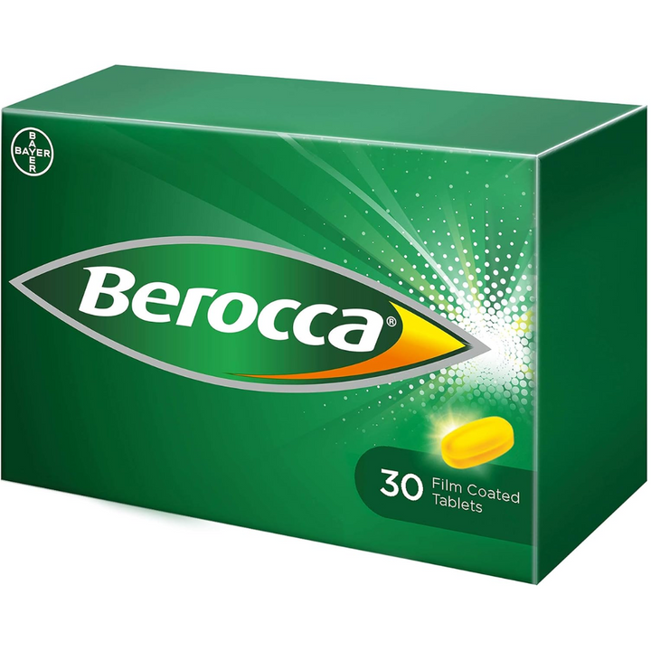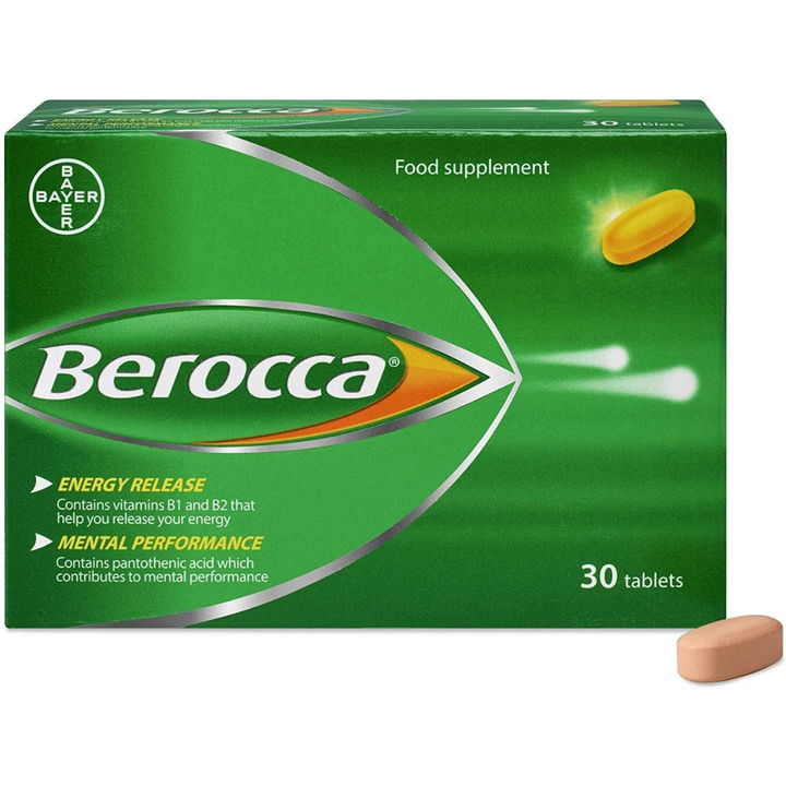 Berocca Film Coated Tablets are packed full of 11 vitamins & minerals including vitamins B1 and B2 to help support natural energy release, B5 to support mental performance and B12 to help reduce tiredness and fatigue. Vitamins B1 and B2 work with your body to naturally convert food to fuel, helping you to release your energy. Berocca is free from caffeine, sugar and artificial stimulants and suitable for vegans. Berocca contains Vitamins B1, B2, B3 (Niacin), B5 (Pantothenic Acid), B6, B7 (Biotin), B9, B12, Vitamin C, Magnesium and Zinc. Per tablet % NRV. Vitamin B1 11.8 mg 1073, Vitamin B2 15 mg 1071, Niacin (B3) 50 mg NE 313, Vitamin B6 8.22 mg 587, Folic Acid (B9) 400 ug 200, Vitamin B12 10 ug 400, Biotin (B7) 150 μg 300, Pantothenic Acid (B5) 23 mg 383, Vitamin C 500 mg 625, Magnesium 100 mg 27, Zinc 10 mg 100, Calcium 100 mg 13.