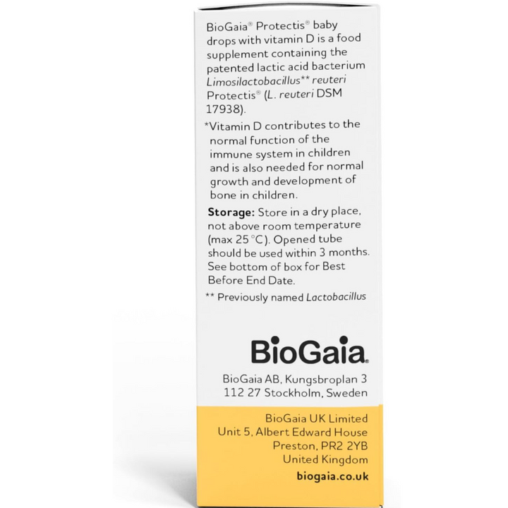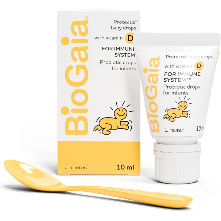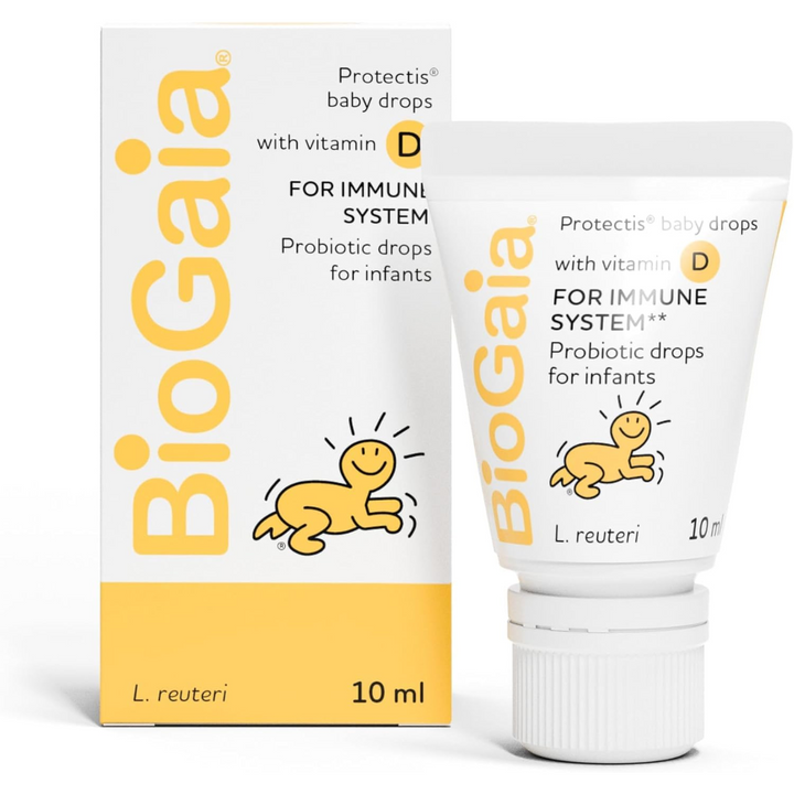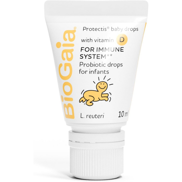 BioGaia Protectis Baby Drops with vitamin D is a multi-award-winning, 2-in-1 probiotic dietary supplement that comes in a squeezable tube for simple and precise dosage, containing the highest quality probiotic bacteria together with the added benefit of vitamin D.