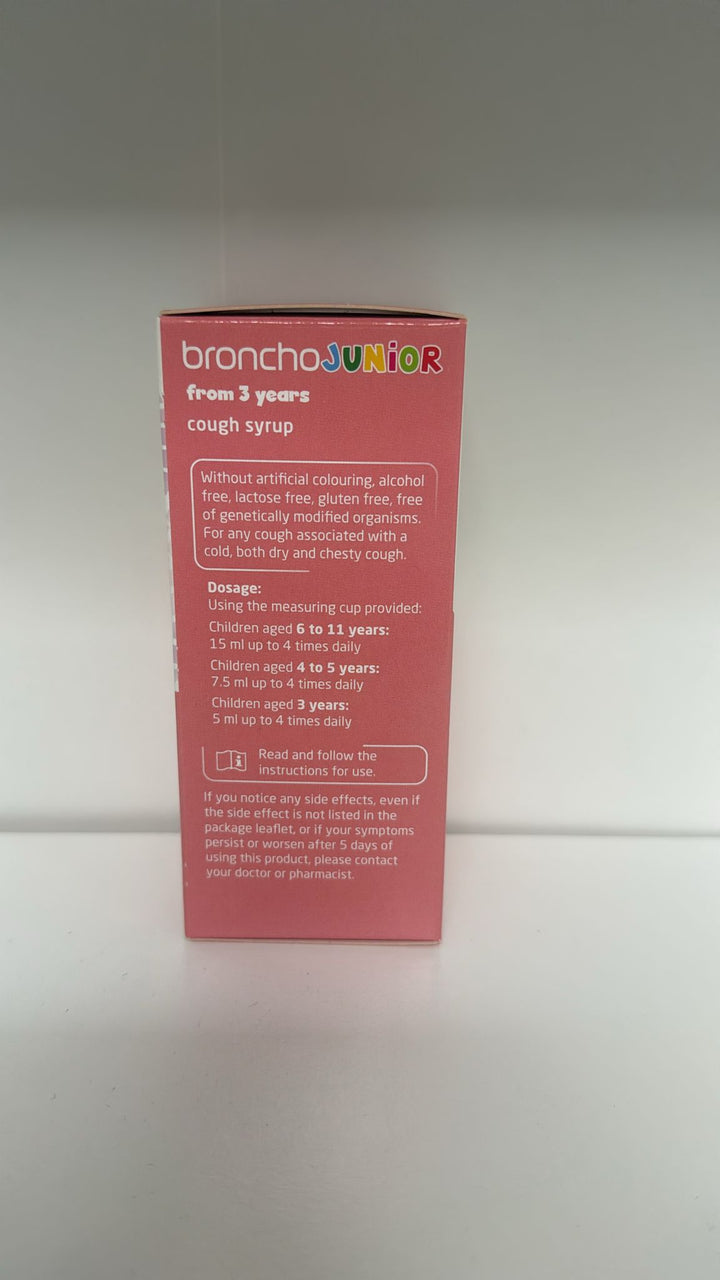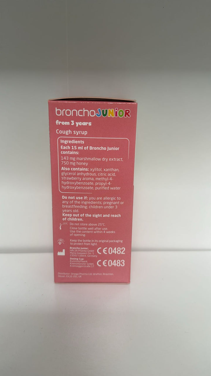 Bronchostop junior cough syruphas been specifically formulated for children. This cough syrup provides a protective balm for the throat, helping to relieve dry or irritating coughs. With natural honey and marshmallow extract this deliciously flavoured cough medicine will be easier for your child to use when they have an irritating cough. Category: Cough, Colds and Sore Throat Manufacturer: PERRIGO Containing Natural Honey and dried extract of Marshmallow Root, BronchoStop contains: