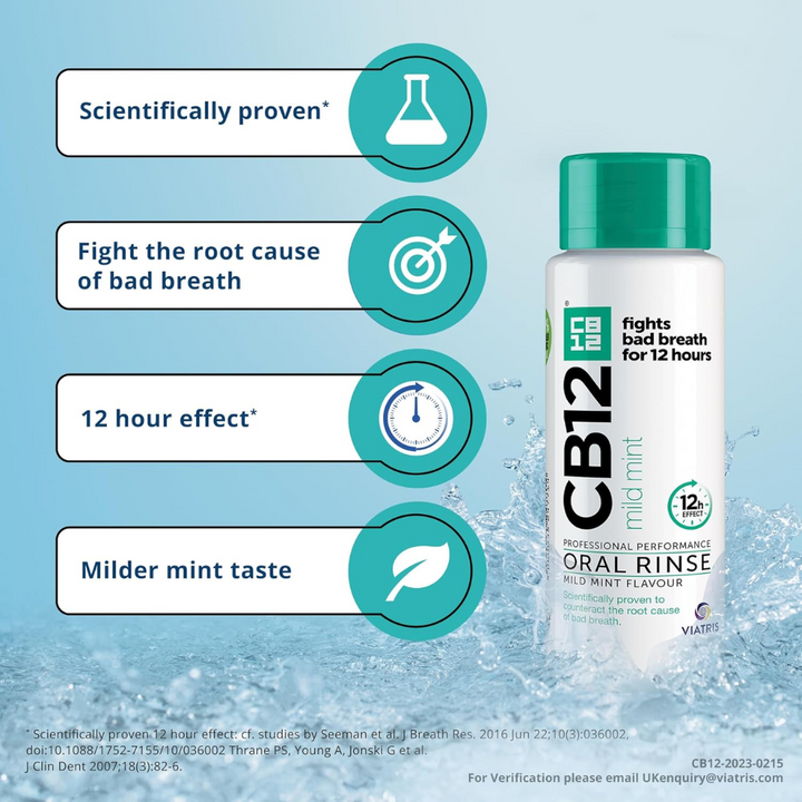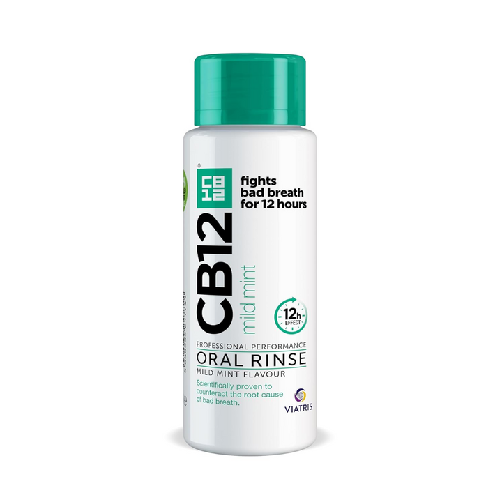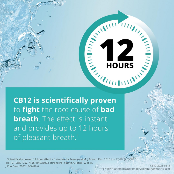 CB12 is a new, unique, long-lasting mouth rinse proven to prevent and neutralise bad breath. CB12 neutralises the substances and processes that cause bad breath by combating all three ‘volatile sulphur compounds’ (VSC) gases that cause bad breath instead of simply masking the smell for a short period of time. The unique combination of Zinc and Chlorhexidine in CB12 targets the ‘VSCs’ from exhaled air and neutralises bad breath. CB12 also contains fluoride to help prevent tooth decay.