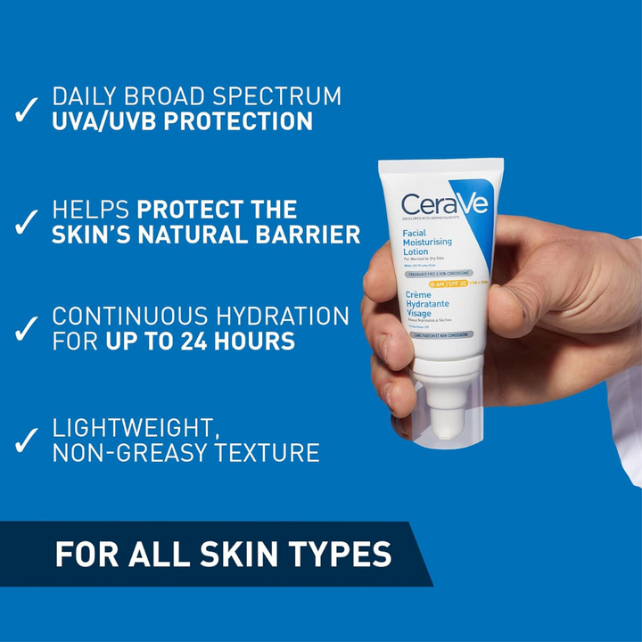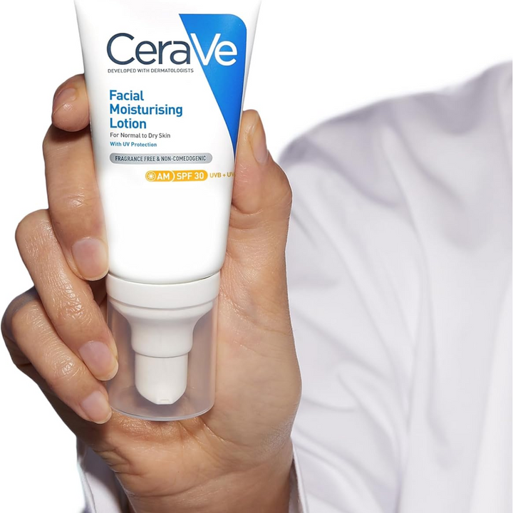 A daily lightweight facial moisturiser with SPF 50+ UVB/UVA protection and 3 essential ceramides, leaves skin feeling soothed, and hydrated for up to 24 hours, while protecting the skin’s natural barrier. ▪ Developed with dermatologists, CeraVe AM Facial Moisturising Lotion SPF50+ is suitable for normal to dry skin on the face. Also suitable for acne-prone skin. ▪ With 3 essential ceramides and SPF50+, the gentle formula contains broad spectrum protection to defend the skin barrier against UVA & UVB rays that deplete ceramides. The fast-absorbing moisturiser also helps protect the skin against pollution particles. ▪ Powered by CeraVe’s patented delivery system, MVE technology, the lightweight lotion offers a continuous release of moisturising ingredients throughout the day, providing up to 24-hour hydration. Skin feels calm and hydrated, and looks balanced. ▪ Non-comedogenic. Fragrance free. Non-greasy texture. ▪ For your daily facial routine, firstly cleanse with CeraVe Hydrating Cleanser for normal to dry skin, or CeraVe Foaming Cleanser for normal to oily skin. Secondly, give your skin a hydration boost with CeraVe Hydrating Hyaluronic Acid Serum, and finally finish with CeraVe AM Facial Moisturising Lotion SPF50+ to hydrate while protecting the skin from daily aggressors. ▪ It also contains Vitamin E and Niacinamide, and leaves skin soothed and hydrated.