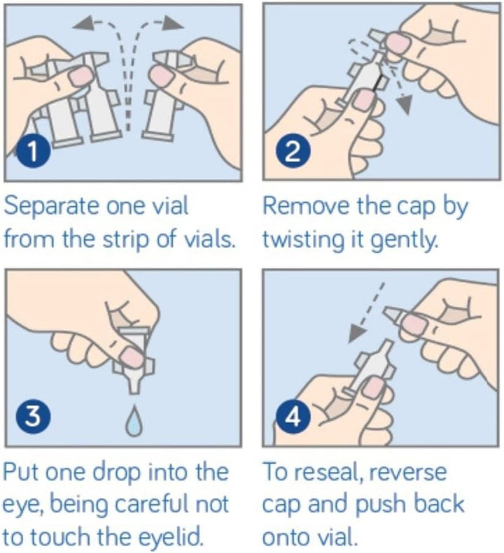 1. Wash your hands. 2. Tear open a single-use vial. 3. Apply one or two drops into the affected eye(s). 4. Discard the vial after use.
