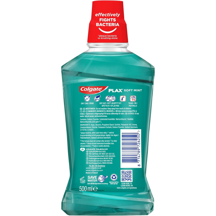 Colgate Plax Mouthwash with CPC (cetylpyridinium chloride) is a clinically proven formula that effectively fights bacteria* and provides 24/7 plaque protection (*plaque bacteria vs brushing alone)