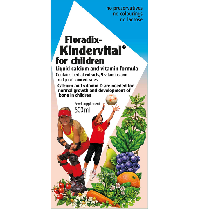 Kindervital For Children 500mlKindervital® for children - fruity formula, Liquid calcium and vitamin formula contains herbal extracts, 9 vitamins and fruit juice concentrates Calcium and vitamin D are needed for normal growth and development of bone in children