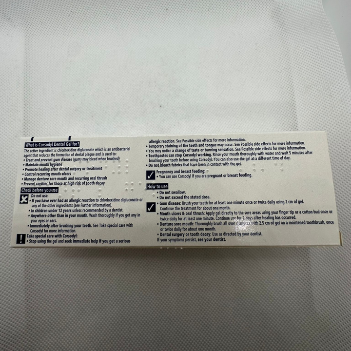 CAUTIONSCorsodyl 1% w/w Dental Gel for gum disease may cause temporary discolouration of the teeth or tongue. This can be removed by twice daily brushing with toothpaste or by your dentist or hygienist. You can reduce the risk of staining by avoiding drinking tea, coffee or red wine, especially up to one hour after use. Children under 12 years of age should not use the product unless recommended by a dentist. |