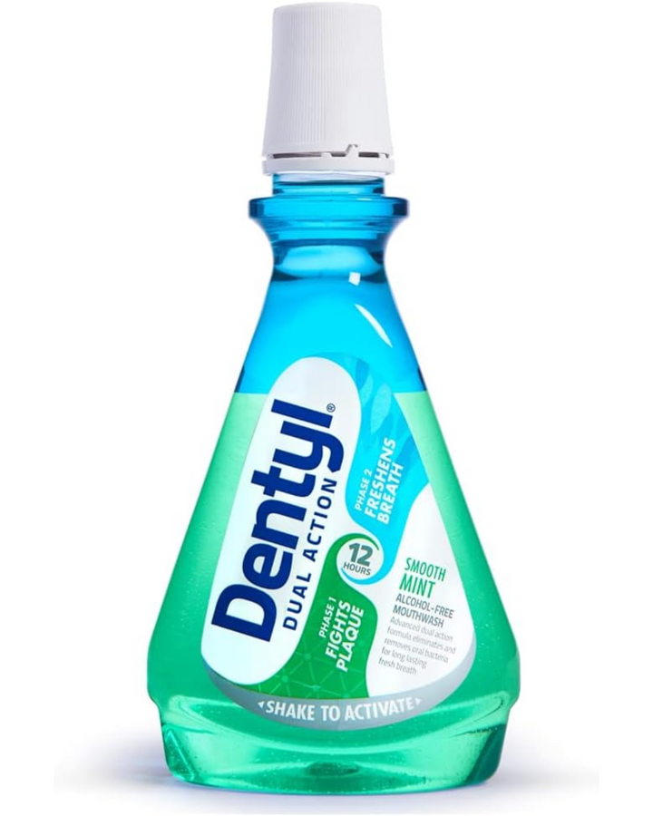 Dentyl Dual Action mouthwash doesn’t just give you fresh breath! It has a unique formulation that combines the powerful antimicrobial agent Cetylpyridinium Chloride (CPC) with the oil Isopropyl Myristate (IPM). When shaken and combined, this advanced formula physically lifts and removes plaque and bacteria from the mouth, which you can see instantly when you rinse. In fact, a recent study found that using Dentyl Dual Action twice-daily reduces plaque by more than 60% after just one month*.