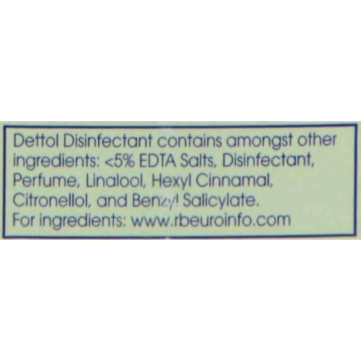 Dettol Disinfectant contains amongst other ingredients:, <5% EDTA Salts, Disinfectant, Perfume, Linalool, Hexyl Cinnamal, Citronellol, Benzyl Salicylate