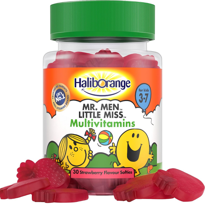 Haliborange Mr. Men little Miss multivitamins strawberry 30 Softies help provide a balanced multivitamin for everyday support. Each yummy strawberry fruit softie contains 8 essential vitamins including vitamin A, C, and D which are recommended by the UK Dept. Of Health. Vitamin A helps to support normal vision. Vitamin C helps to support the immune system. Vitamin D essential for normal growth and development of bones in children. Vitamin B12 contributes to normal red blood cell formation.