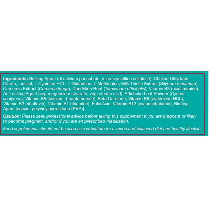 Bulking Agents (di- calcium phosphate, microcrystalline cellulose), L-Cysteine, L-Glutamine, L-Methionine, Choline citrate, Dandelion Root (Taraxacum officinalis), Inositol, Artichoke leaf powder, Standardised Milk Thistle Extract, Curcumin Extract, Anti-caking agents (veg.magnesium stearate, veg. Stearic acid, silicon dioxide), Beta carotene, Glazing Agent (opadry clear), Niacin (nicotinamide), Pantethonic acid (calcium pantothenate), Vitamin B6 (pyridoxine HCL), Riboflavin (vitamin B2), Thiamin HCL (vitamin B1), Folic acid, Vitamin B12 (cyanocobalamin).