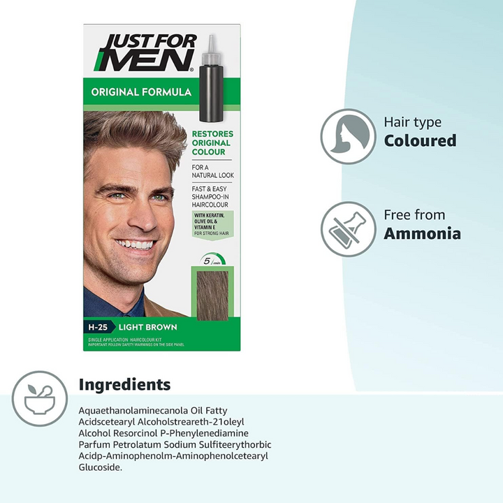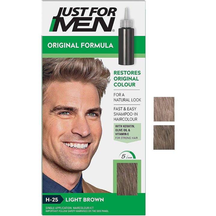 Just For Men Original Formula Light Brown Hair Dye H-25 targets only your grey hairs and replaces them with subtle tones that match your own natural hair colour. You will see perfect results in just 5 minutes, which last up to 6 weeks until the grey hairs grow out. Just for Men’s colour shampoo is quickly and easily applied and after it is complete you can shampoo as often as you like and treat your hair the way you always have. It is free from ammonia and leaves your hair in great condition once it is coloured.