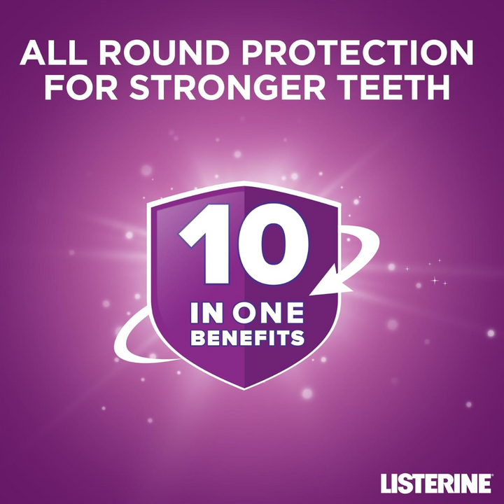 Maintain a clean and healthy mouth with Listerine Total Care Antibacterial Mouthwash. Designed to kill up to 99% of plaque and bad breath-causing germs, the mouthwash leaves breath fresh for up to 24 hours after use (when used twice daily). The oral care rinse features 10-in-1 benefits;