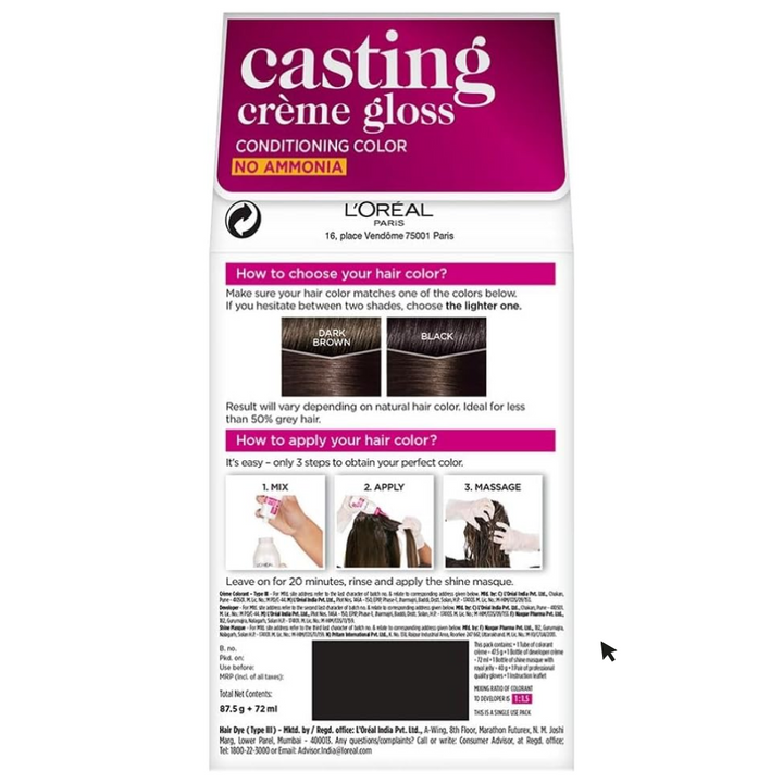 Casting Creme Gloss by L'OrÉal Paris is a low commitment semi permanent hair dye: ammonia free for a pleasant smell. Perfect for first time colourers to blend away grey hair – provides a natural looking finish.
