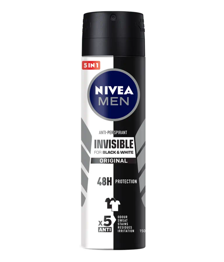 PRODUCT DETAILSNIVEA MEN Black & White Invisible Original Anti-Perspirant offers powerful anti-perspirant protection without the risks of white marks on black clothing and yellow stains on white clothing. The unique formula protects you for 48 hours against perspiration while gently caring for your skin in the process. Say Goodbye to white and yellow stains on your clothes and get the reliable protection and care that you deserve! The skin tolerance of this anti-perspirant has been dermatologically proven.