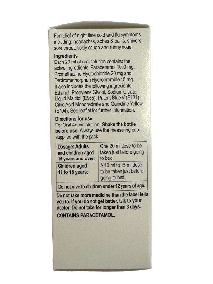 Provides symptomatic night time relief of colds, chills and influenza.