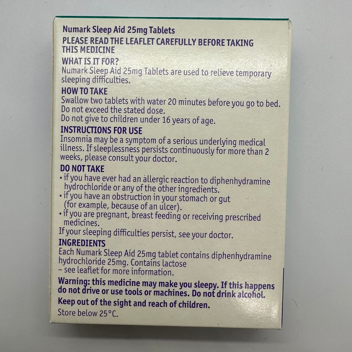 - Numark Sleep Aid 25mg 20 Tablets helps you to fall gently asleep