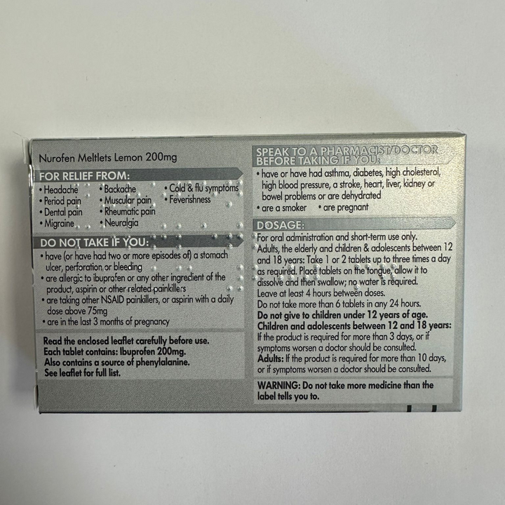 Nurofen Meltlets relieve pain, reduce inflammation and temperature. Ideal for providing relief from a range of symptoms, including migraine, headaches, cramping and period pain, dental pain, neuralgia, rheumatic and muscular pain, feverishness and symptoms of cold and flu.