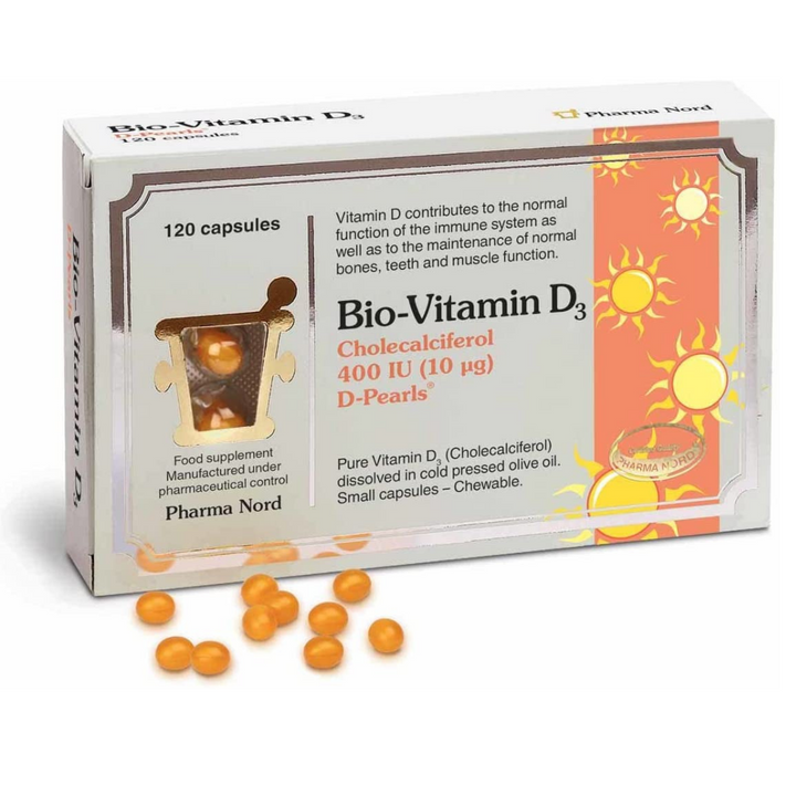 | Vitamin D3 supports immunity, muscle function and the maintenance of teeth and bones. Bio-Vitamin D3 are dissolved in cold-pressed olive oil and in small, easy-to-swallow pearls. Bio-Vitamin D3 uses the ideal form of vitamin D for the body and demonstrates proven bio-availability.IngredientsOlive oil, capsule shell: bovine gelatin, humectant: glycerol, purified water, cholecalciferol (vitamin D3)