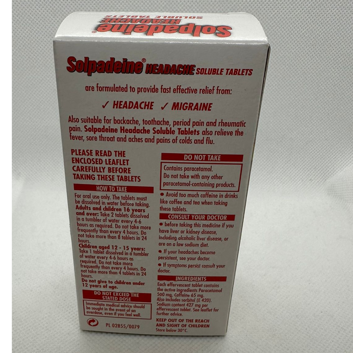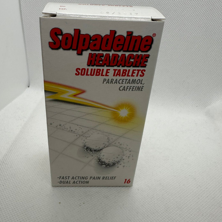 | Solpadeine Headache Soluble Tablets contain a dual action formula of Paracetamol and Caffeine for fast and effective pain relief. The soluble tablets get to work 2x faster than Paracetamol alone* PARACETAMOL relieves your pain symptoms CAFFEINE helps speed up the absorption of Paracetamol Solpadeine Headache Soluble Tablets are suitable for headaches, migraine, backache, toothache, rheumatic pain and dysmenorrhoea (period pain), and relief of the symptoms of colds, flu, and sore throats. (*Based on absorption data)
