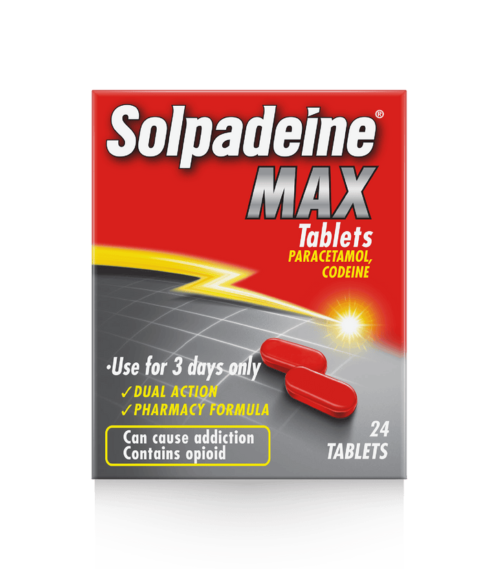 Solpadeine Max Tablets provide powerful pain relief from a range of ailments, such as headaches, period pain, migraines and dental pain. This large pack containing 24 tablets is perfect for targeting symptoms relating to occasional moderate pain. A large pack of max strength red capsule-shaped tablets that provides powerful strong pain relief for conditions such as headache, backache, sinusitis, dental pain, arthritic and muscle pain, nerve pain (neuralgia), migraine and period pain. Solapdeine Max tablets contain Paracetamol and Codeine. Paracetamol is a widely used pain killer suitable for mild pain relief. It is well tolerated and has few side effects. Codeine is a centrally acting opiate pain killer much like Morphine which is in the same family. Codeine can cause drowsiness and is addictive so the medicine should not be used to manage chronic pain. Dosage: Adults: Two tablets to be taken up to four times a day as needed but no more regularly than every four hours. No more than two tablets per dose. No more than eight tablets in 24 hours. Solpadeine Max Contains: Each tablet contains Paracetamol 500mg and Codeine Phosphate hemihydrate 12.8mg per tablet. WARNING: Contains codeine. Maximum 3 days use. May cause addiction. Product WarningsWho should not use Solpadeine Max Tablets?This medicine should not be used by the following groups of patients without first seeking medical advice from your GP or our Pharmacist: